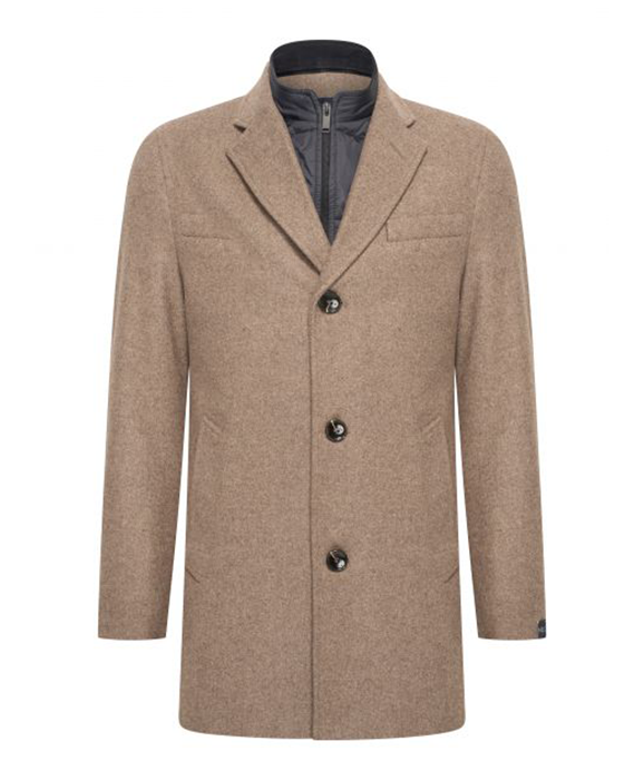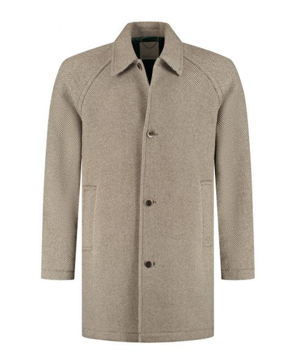 Met zijn subtiele visgraatdessin, Kent‐kraag en knopen is deze beige mantel echt een statement piece. Dankzij de regular fit voelt hij ruim genoeg om laagjes te dragen, zonder dat je er op gegaan uitziet. De mix van wol en polyester biedt warmte én een nette uitstraling. Ideaal voor dagen dat je tussen kantoor en buiten onderweg bent.