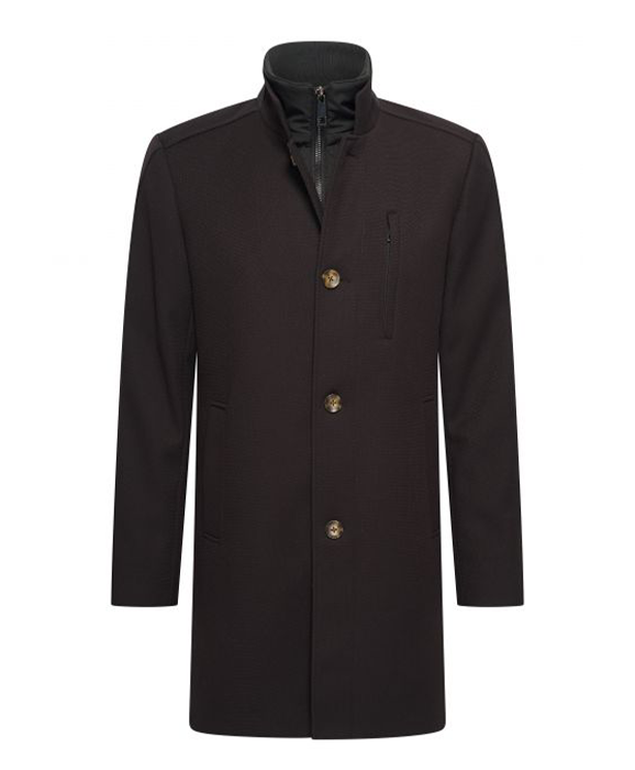 Een klassieke bruine wollen mantel met knoopsluiting die met slim fit pasvorm je silhouet mooi omlijst. Dankzij de wolmix met een tikje synthetisch blijft hij sterk en scheurvast, terwijl de effen look hem veelzijdig maakt. de perfecte jas boven een coltrui én over je nette pak. Duurzaam én stijlvol: een jas om jarenlang op terug te vallen.