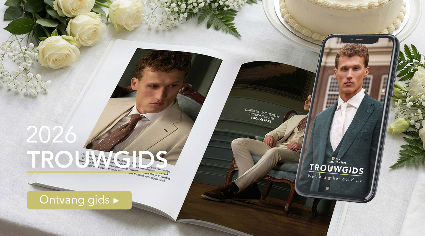 Je trouwdag is een van de meest bijzondere dagen in je leven. Alles moet kloppen, van de locatie tot de taart – en natuurlijk jouw outfit. Het kiezen van een trouwpak kan overweldigend lijken, vooral als het je eerste pak is. Gelukkig hoef je dit niet alleen te doen. Bij Jac Hensen staan onze ervaren trouwspecialisten klaar om je stap voor stap te begeleiden.